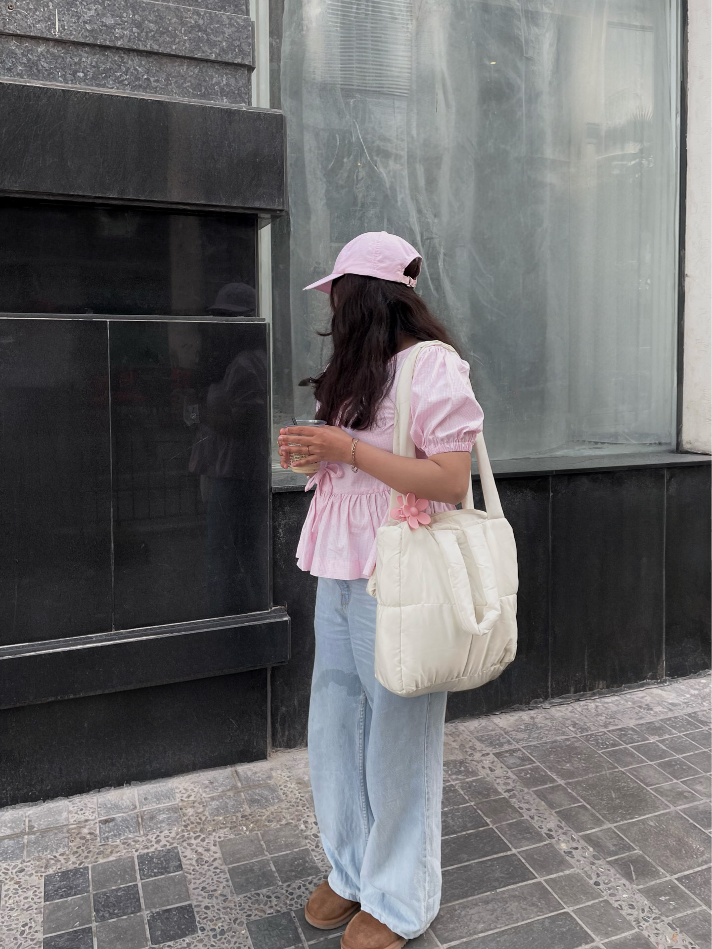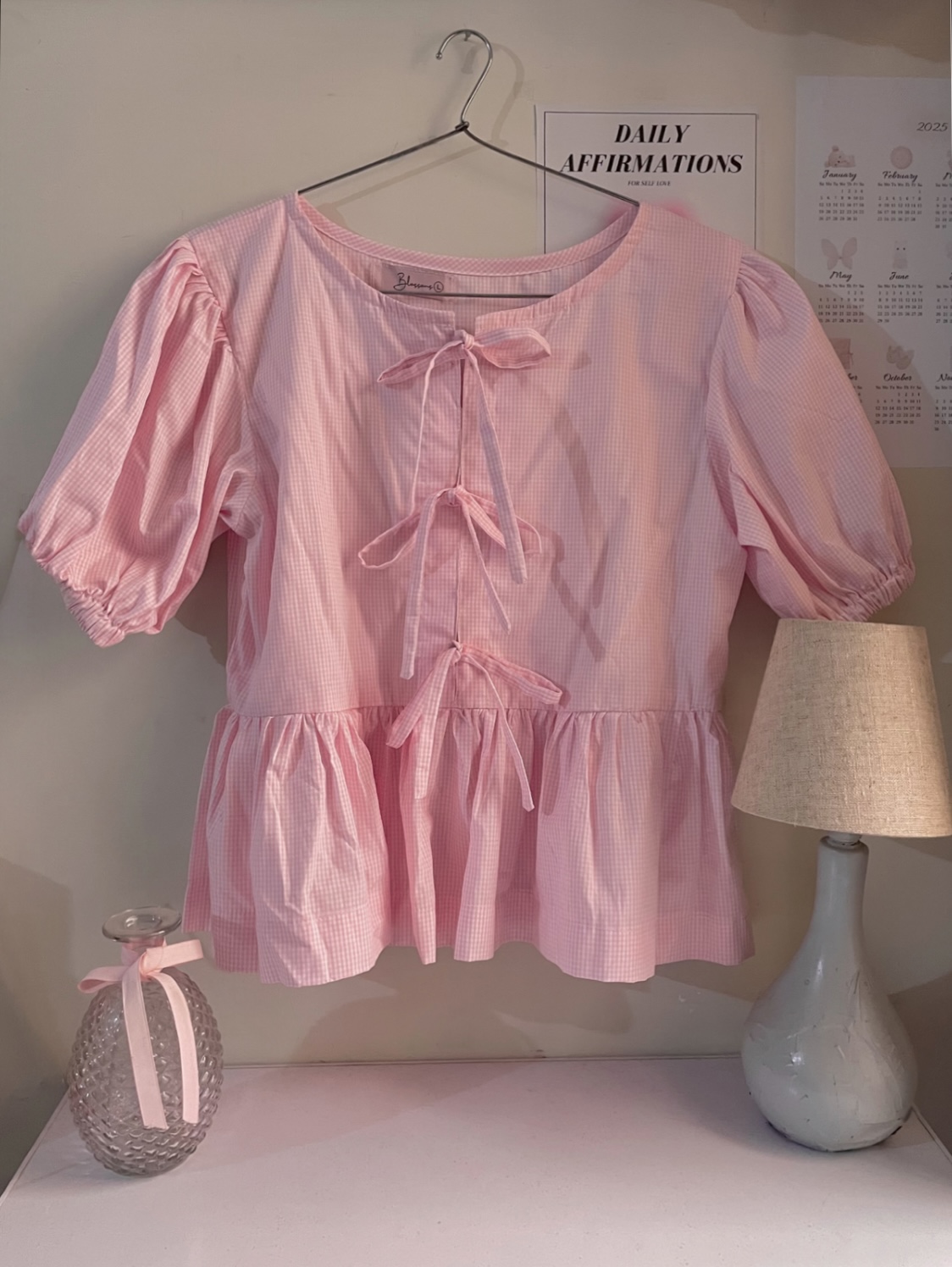 Embrace everyday romance with our sweet pinstripe blouse. This charming pink top features delicate puff sleeves, a flattering tie-front detail, and a ruffled peplum hem. It’s the perfect piece for adding a touch of playful femininity to your favorite pair of jeans.