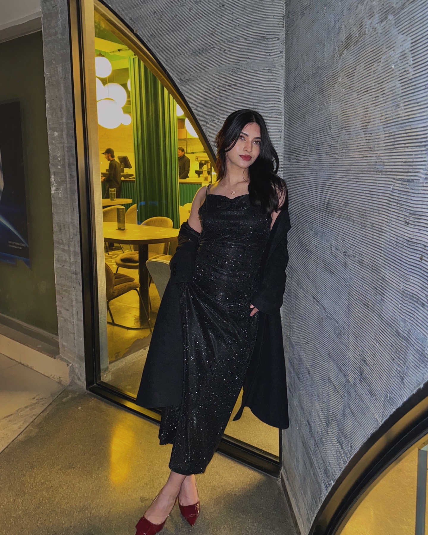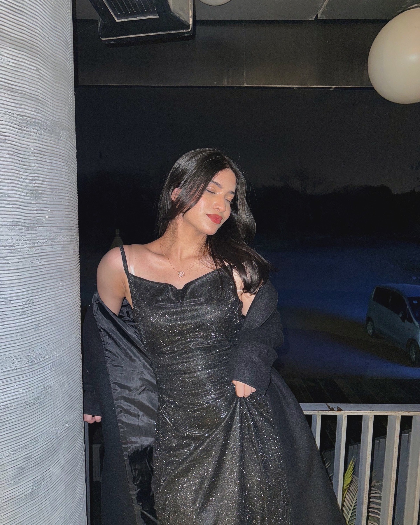 Make every entrance a grand one with our stunning shimmer gown. This elegant black dress is crafted from a dazzling fabric that catches the light beautifully. Featuring a graceful cowl neckline and delicate spaghetti straps, its sleek silhouette is designed to flatter, making it the perfect choice for any formal event.