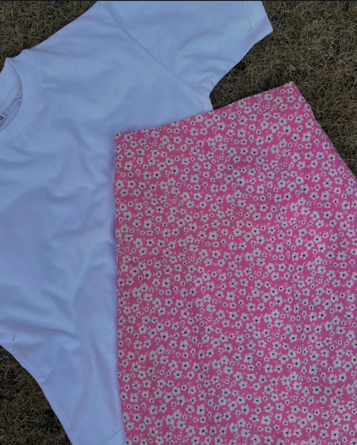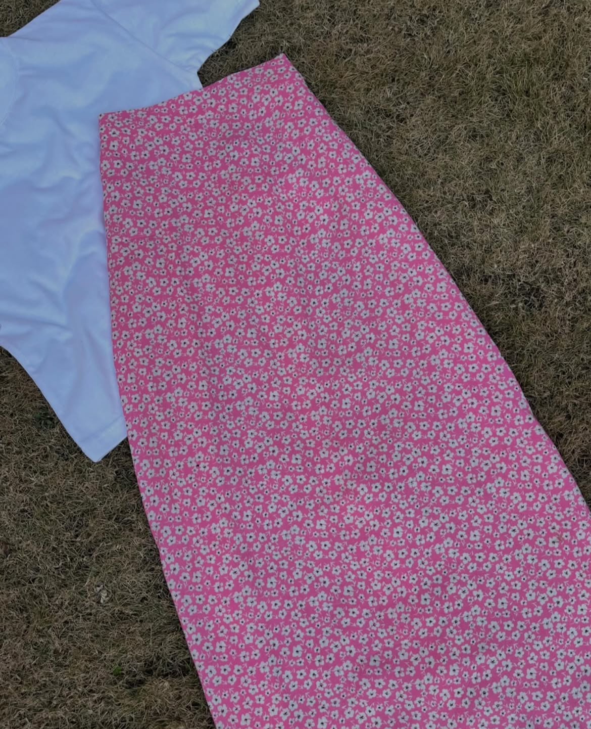 Brighten up your day with our charming pink ditsy floral skirt. This piece features a playful all-over print on a lightweight, comfortable fabric. Its classic, straight silhouette makes it a versatile and essential piece for any wardrobe.