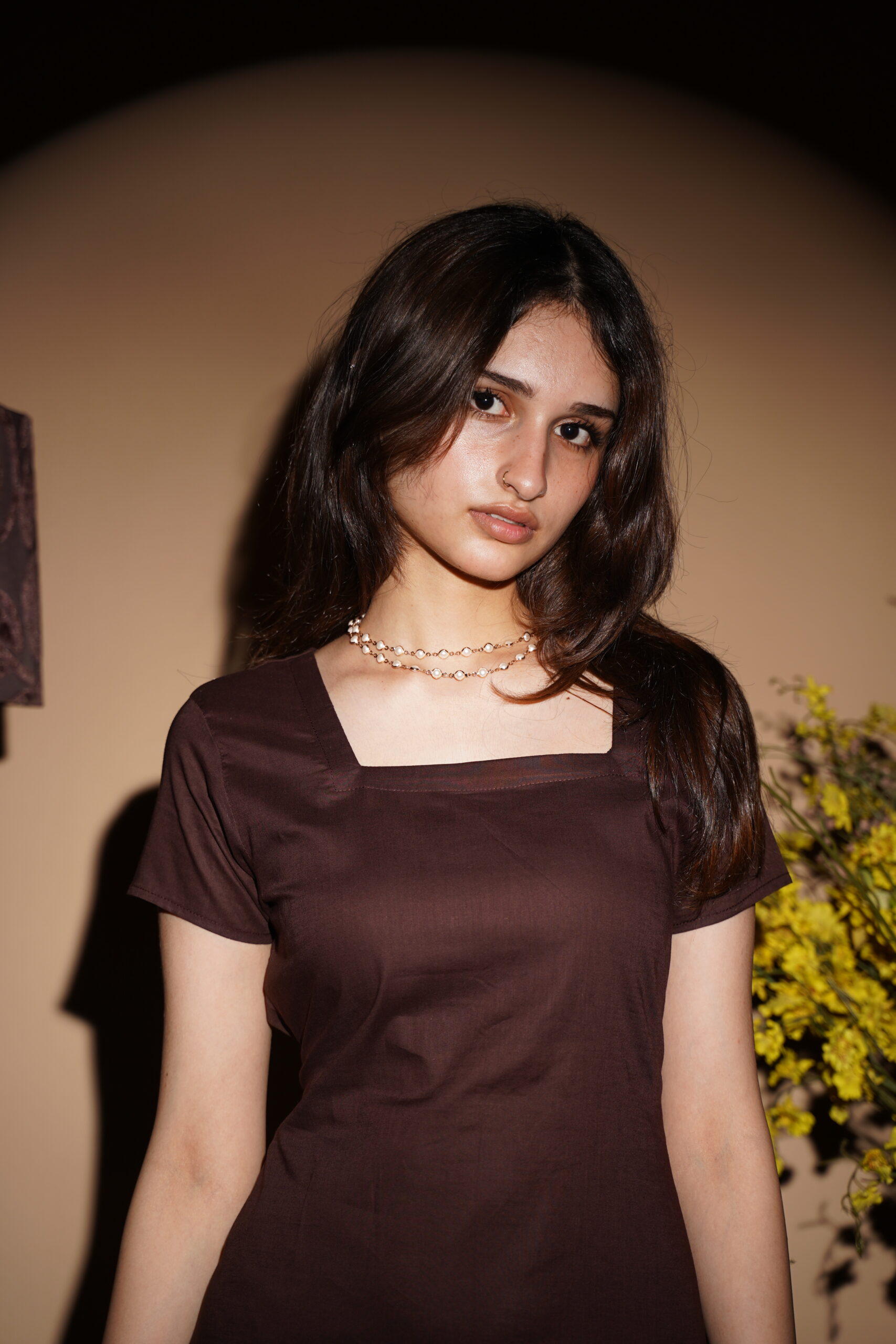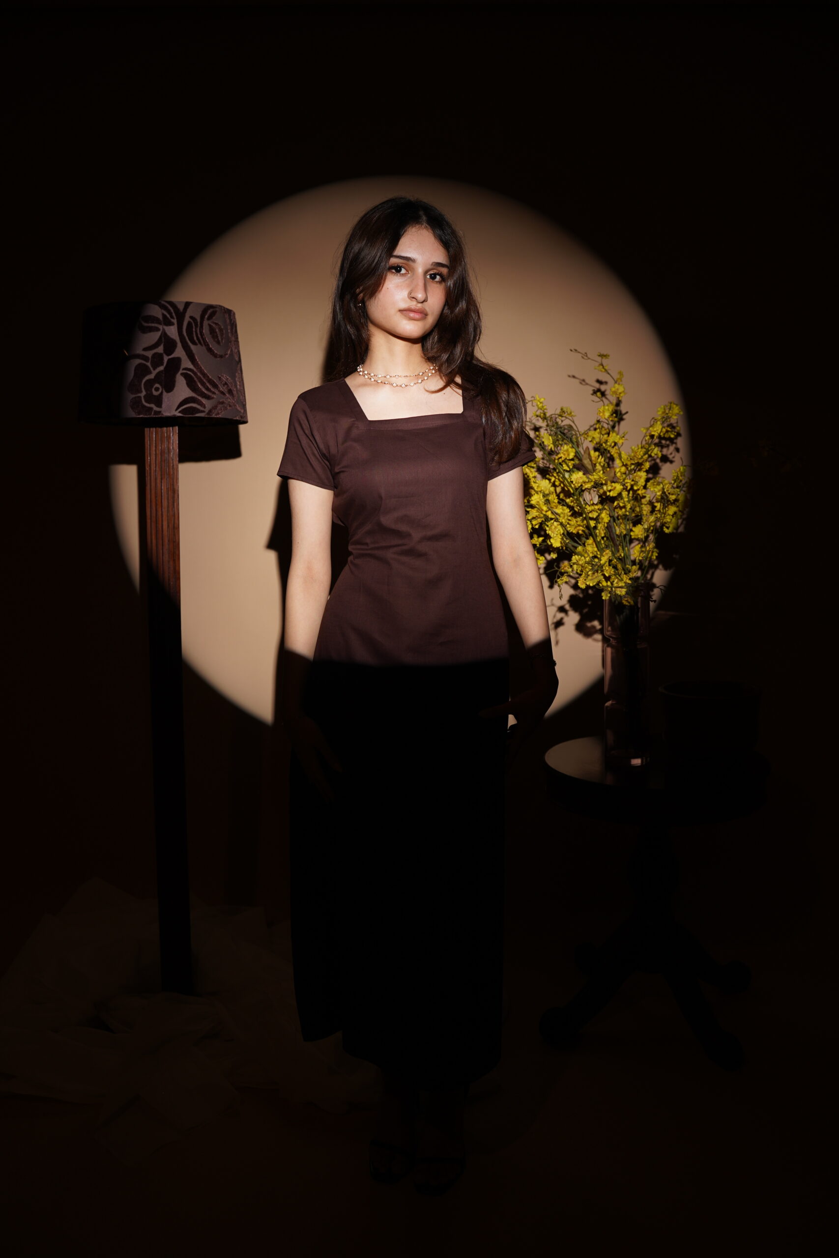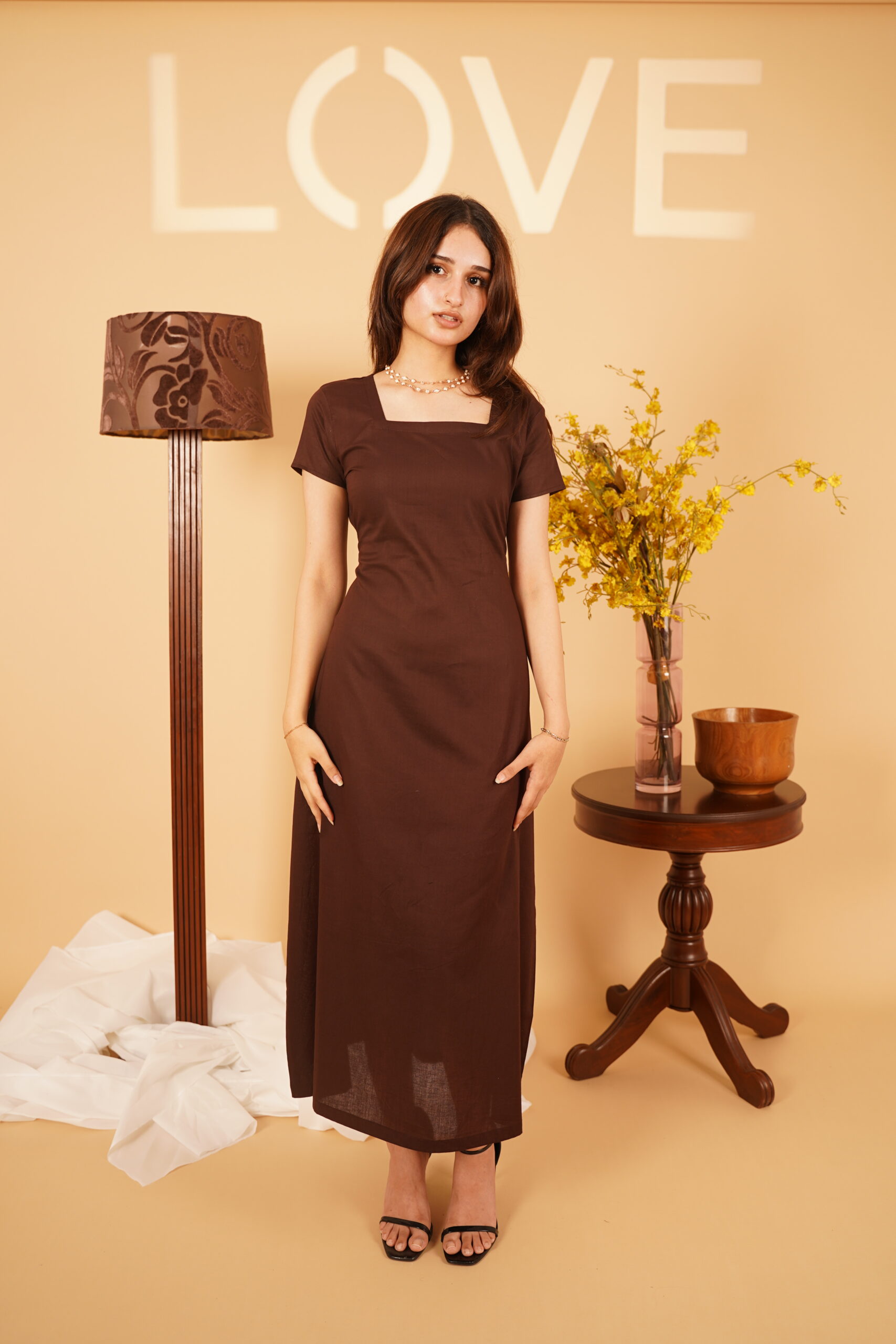 This chic brown midi dress offers a sleek and modern silhouette, perfect for both casual and semi-formal occasions. Crafted from soft, breathable fabric, it features a square neckline and short sleeves for a comfortable yet stylish fit. Ideal for elevating your wardrobe, pair it with heels and delicate jewelry for a refined look. The minimalist design adds versatility, making it a timeless addition to any collection.