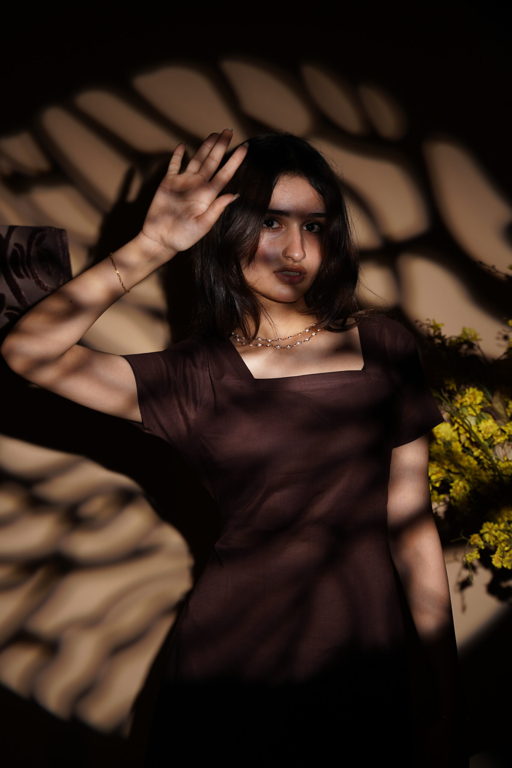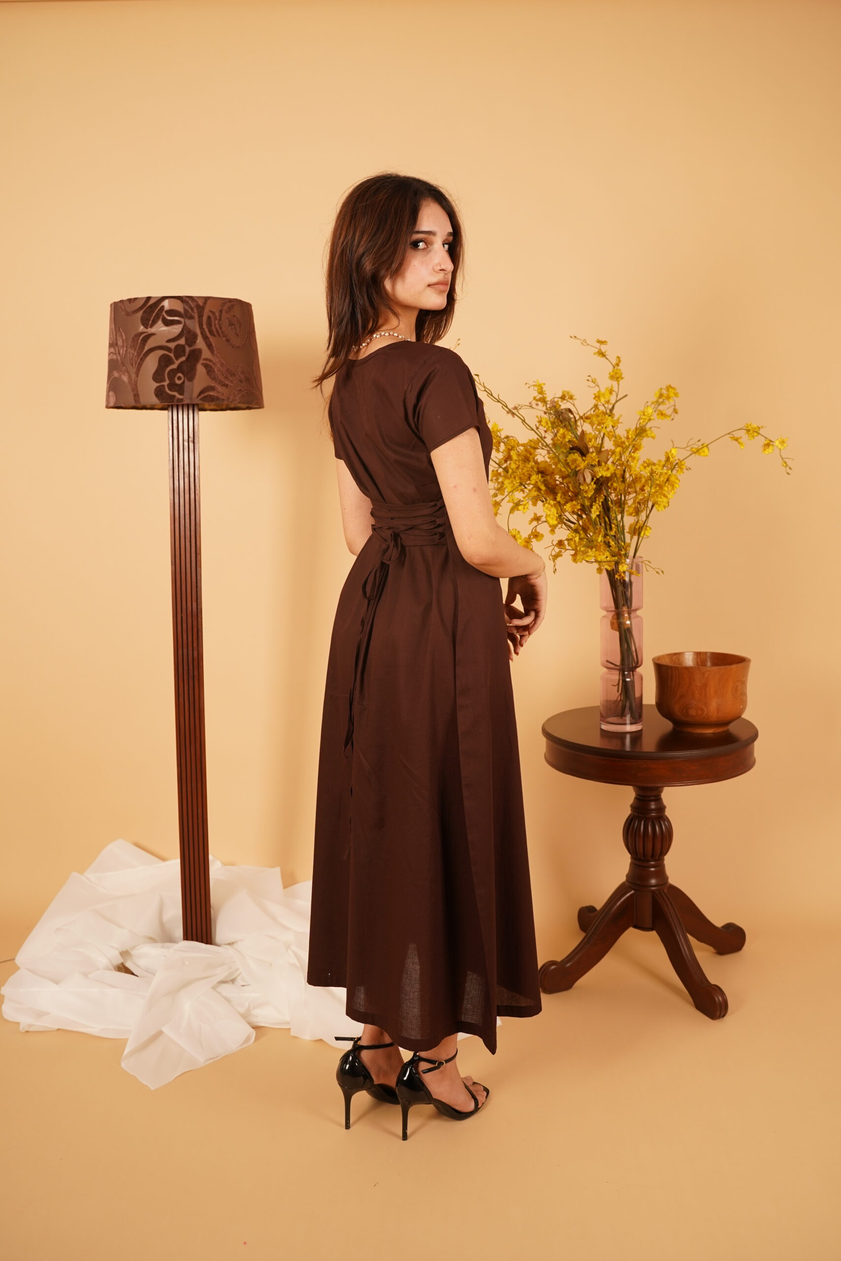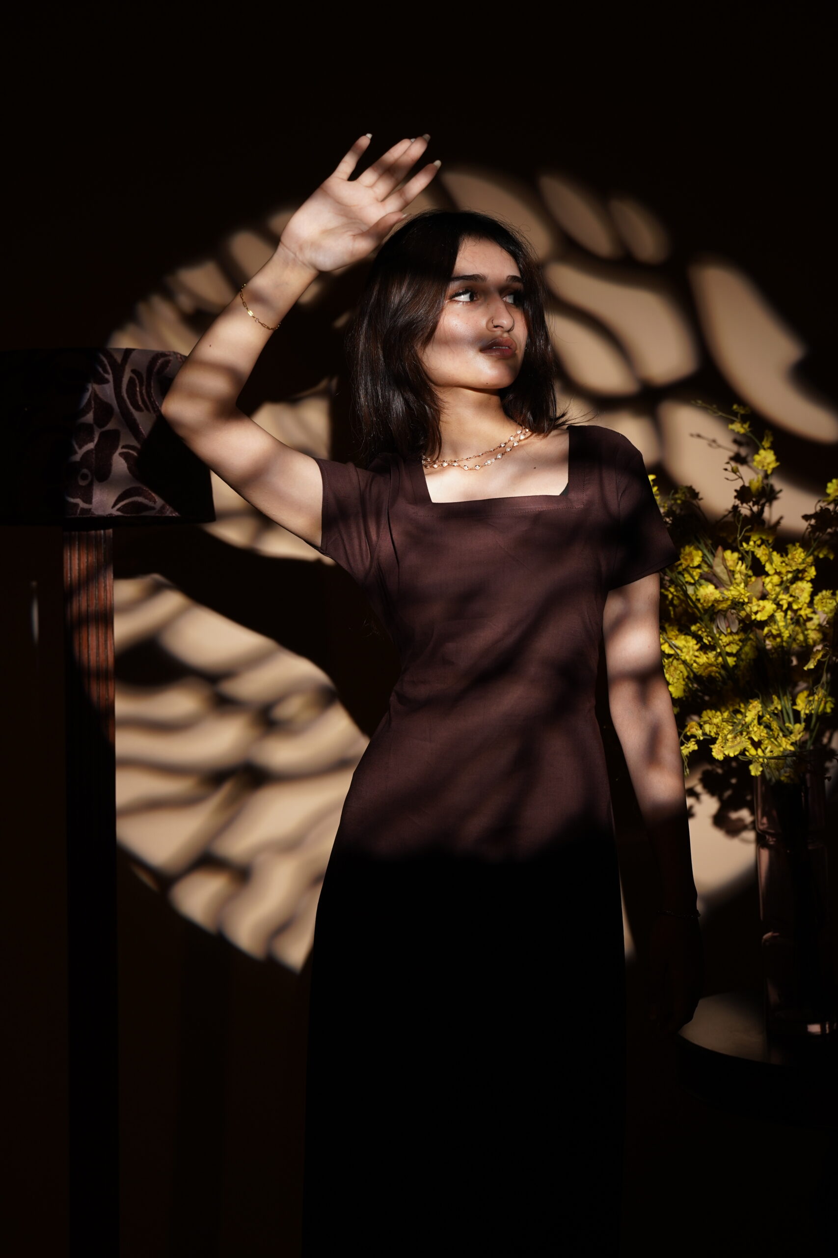 This chic brown midi dress offers a sleek and modern silhouette, perfect for both casual and semi-formal occasions. Crafted from soft, breathable fabric, it features a square neckline and short sleeves for a comfortable yet stylish fit. Ideal for elevating your wardrobe, pair it with heels and delicate jewelry for a refined look. The minimalist design adds versatility, making it a timeless addition to any collection.