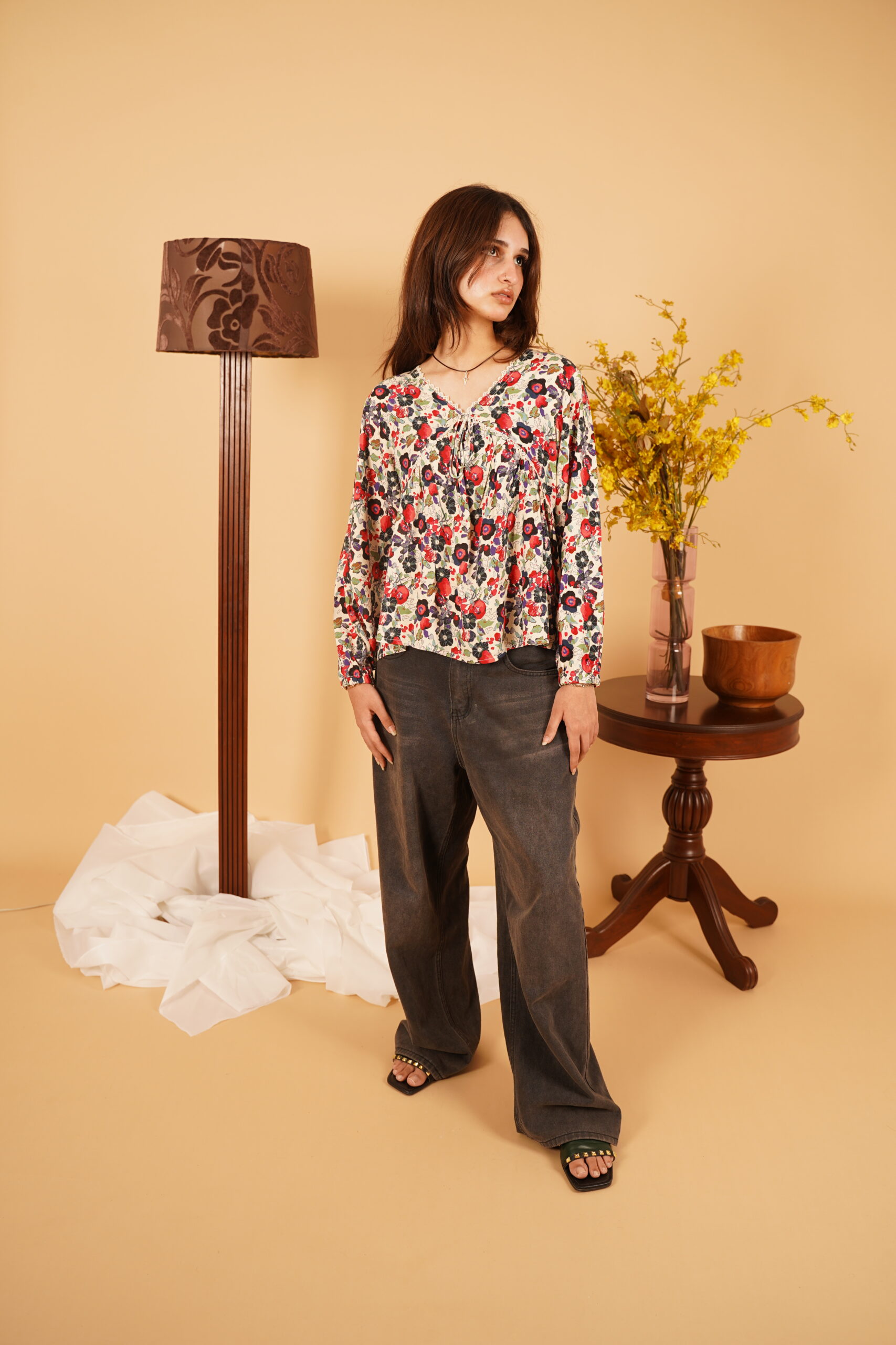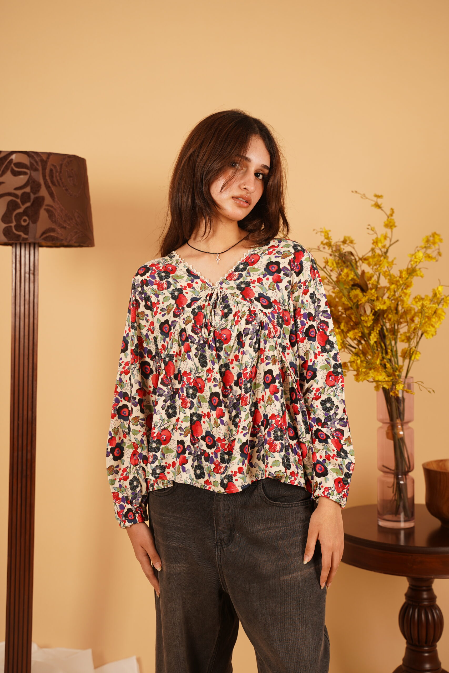 Unleash your inner artist with our vibrant floral peasant blouse. This top features a striking pattern of bold red poppies and deep-hued botanicals, set against a soft cream background. The relaxed, flowy fit and delicate tie-neck detail create an effortlessly chic and comfortable look, perfect for any creative spirit.