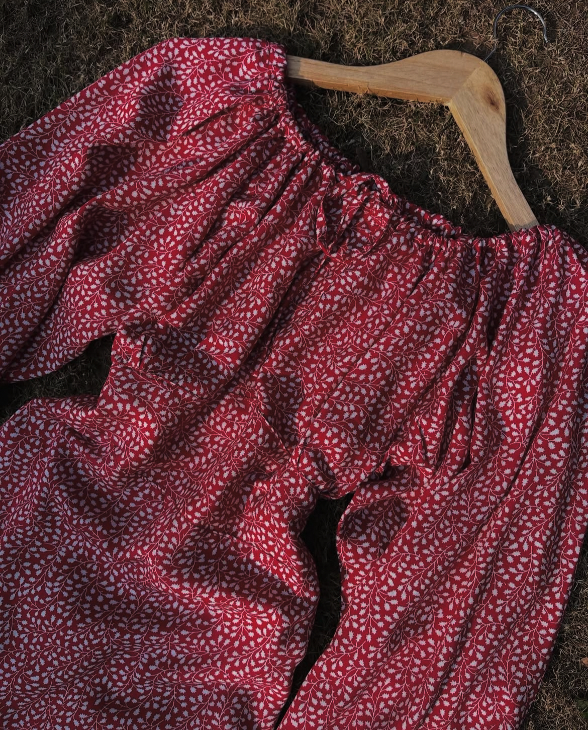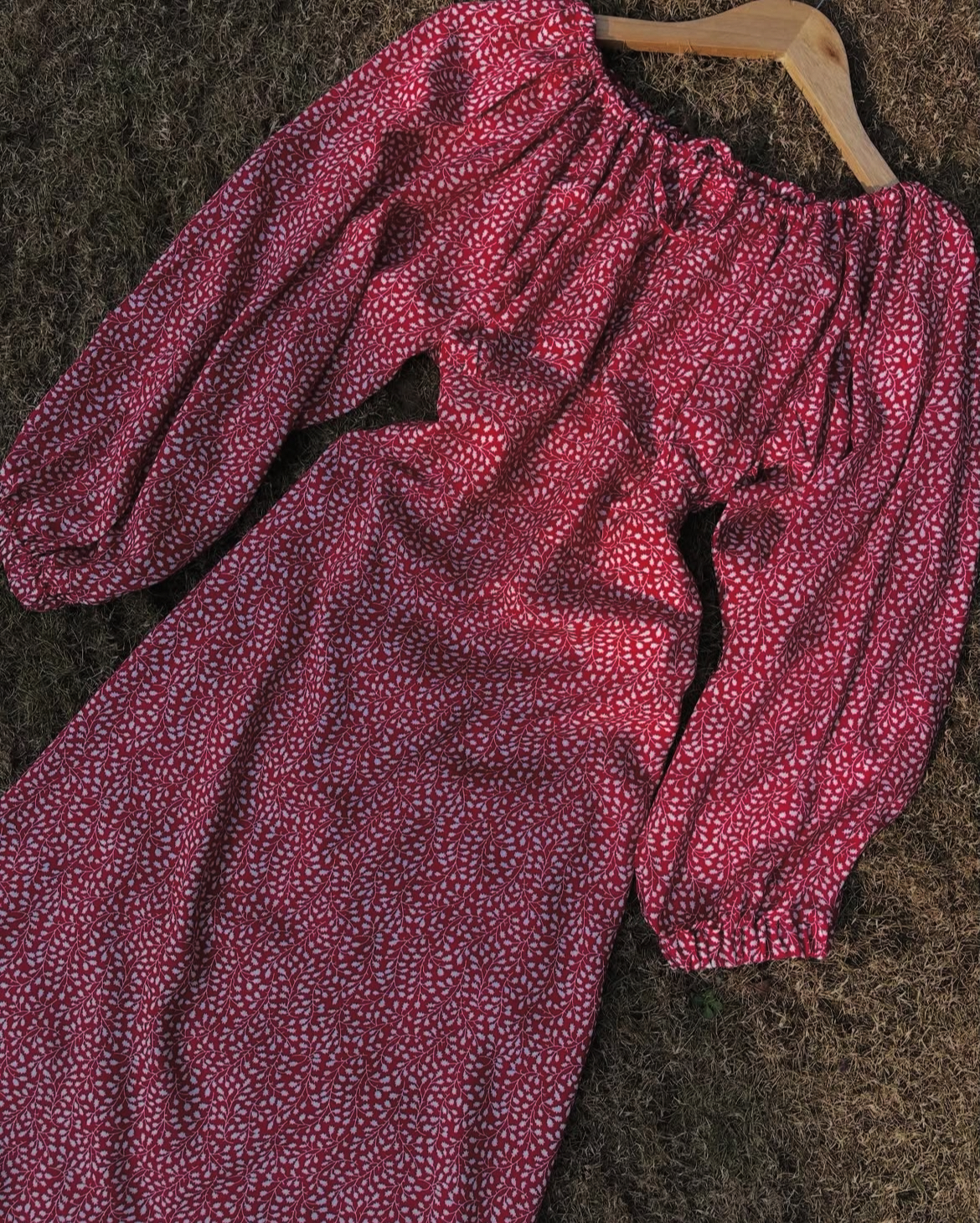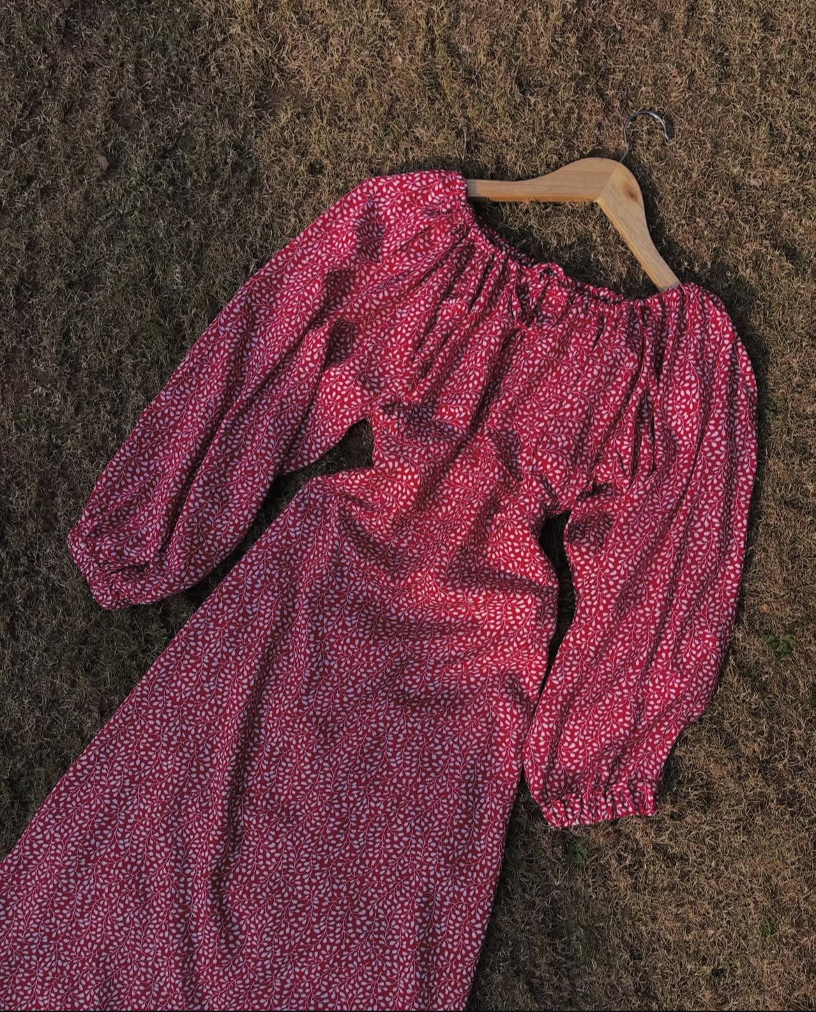 This elegant red floral dress features a rich red base with delicate white leaf patterns, offering a bold yet sophisticated look. Made from lightweight fabric, it includes long puffed sleeves and a flowy midi length for a comfortable fit. Perfect for casual outings or special occasions, pair it with heels and simple accessories for a chic style.