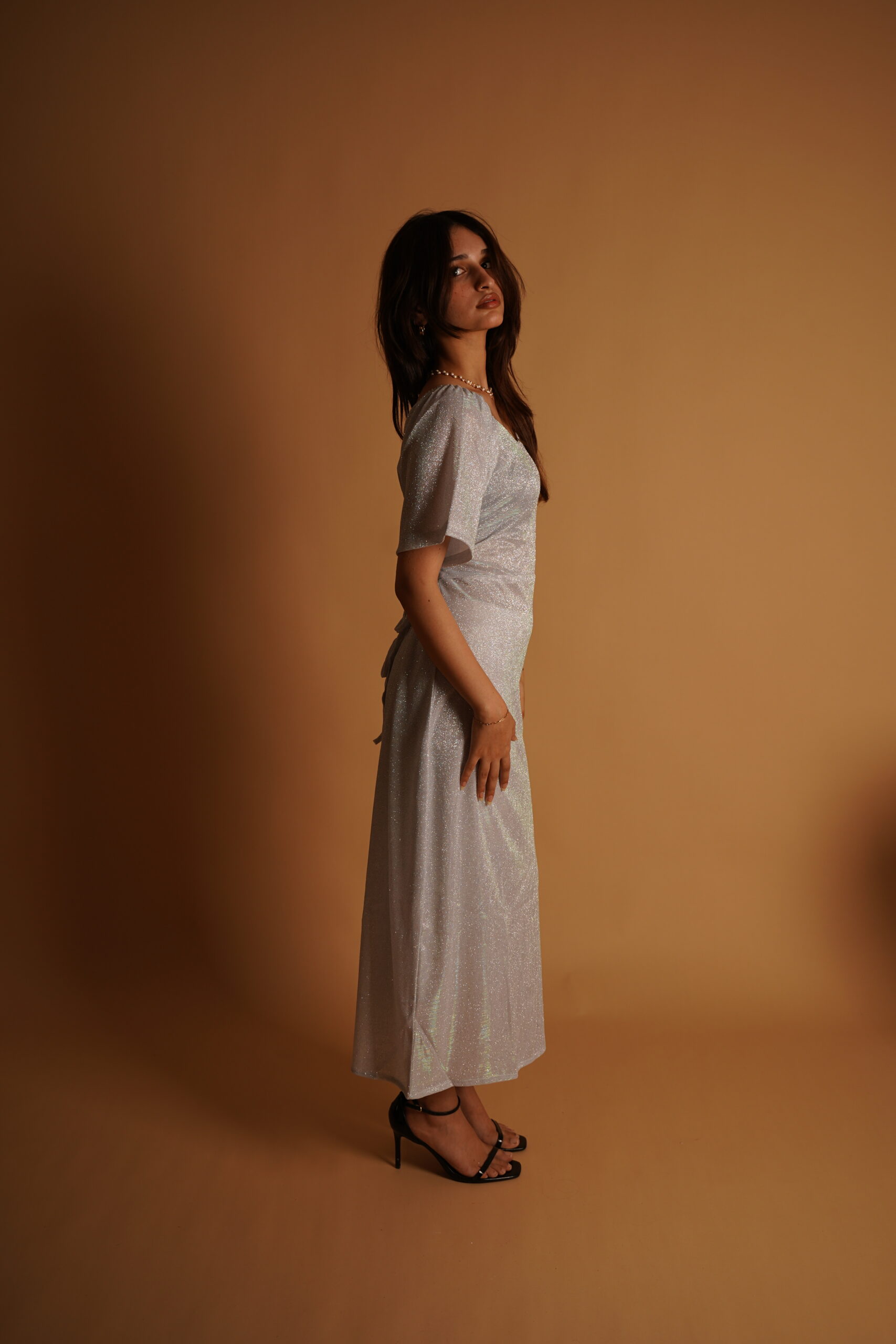 Step into a celestial dream with our stunning Silver Starlight Gown. This breathtaking dress is crafted from a shimmering fabric that glows with an ethereal light. Featuring elegant flutter sleeves and a graceful silhouette, it's the perfect choice for making a sophisticated and memorable entrance.