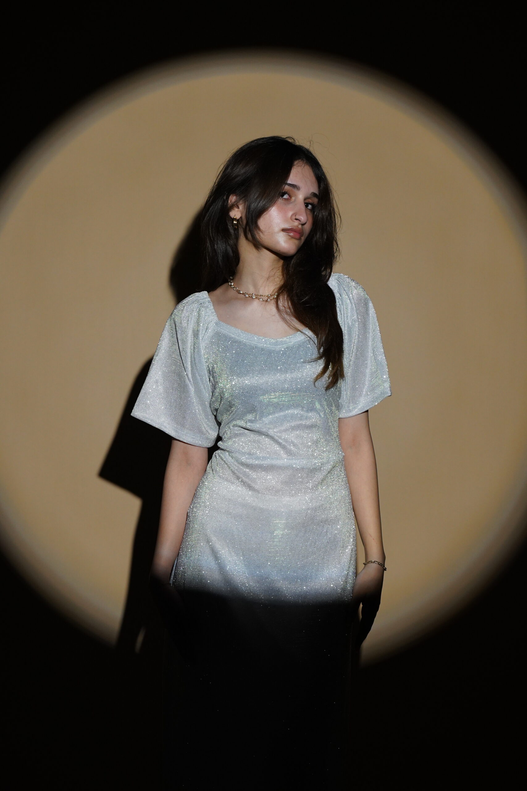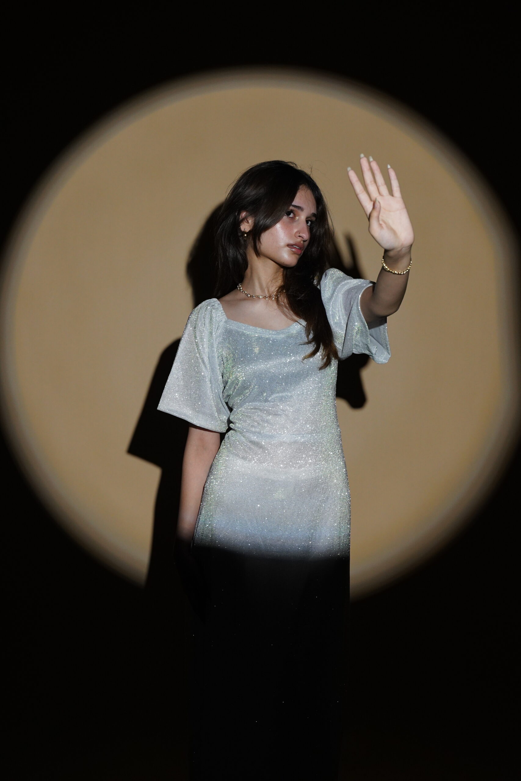 Step into a celestial dream with our stunning Silver Starlight Gown. This breathtaking dress is crafted from a shimmering fabric that glows with an ethereal light. Featuring elegant flutter sleeves and a graceful silhouette, it’s the perfect choice for making a sophisticated and memorable entrance.