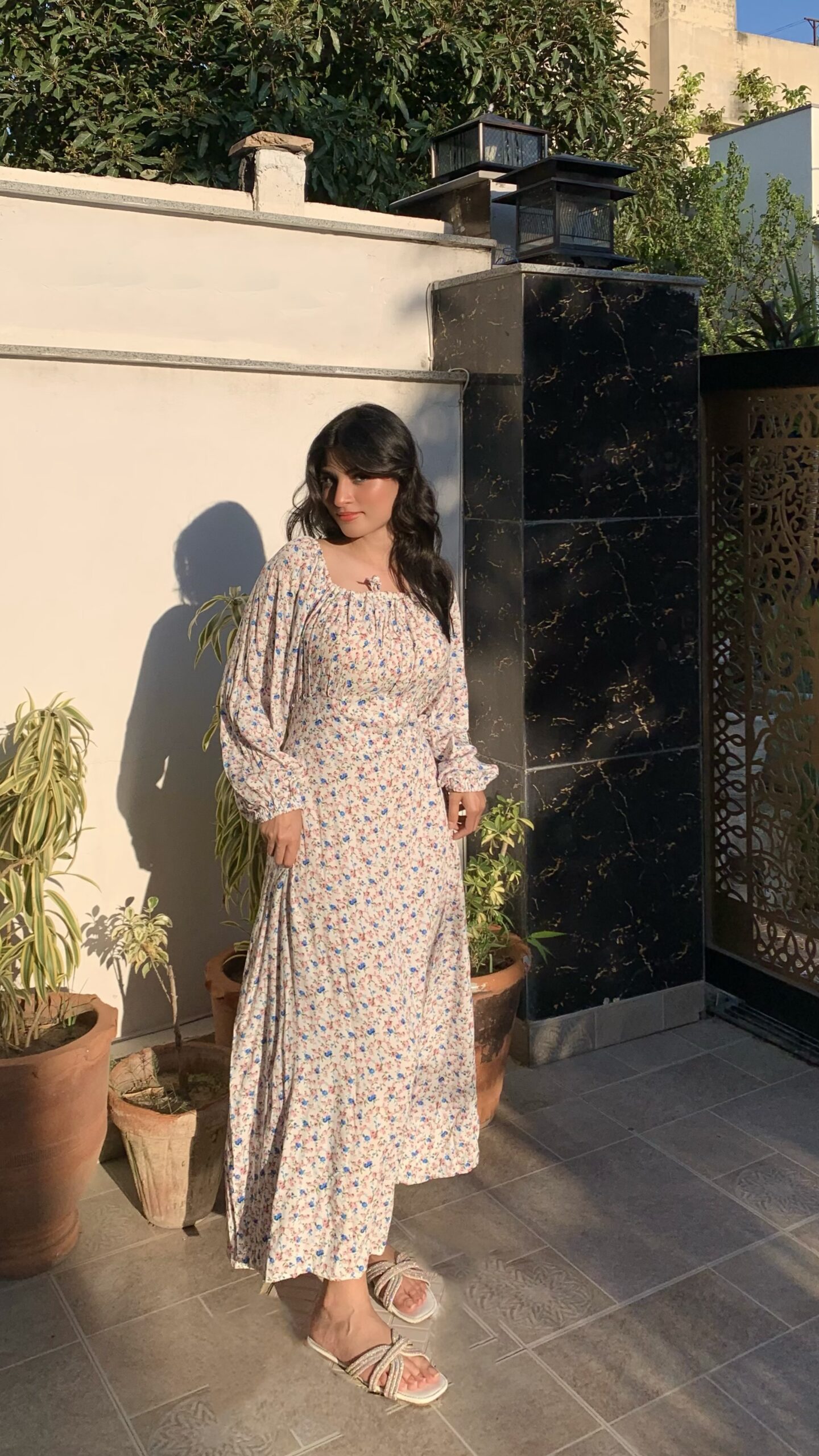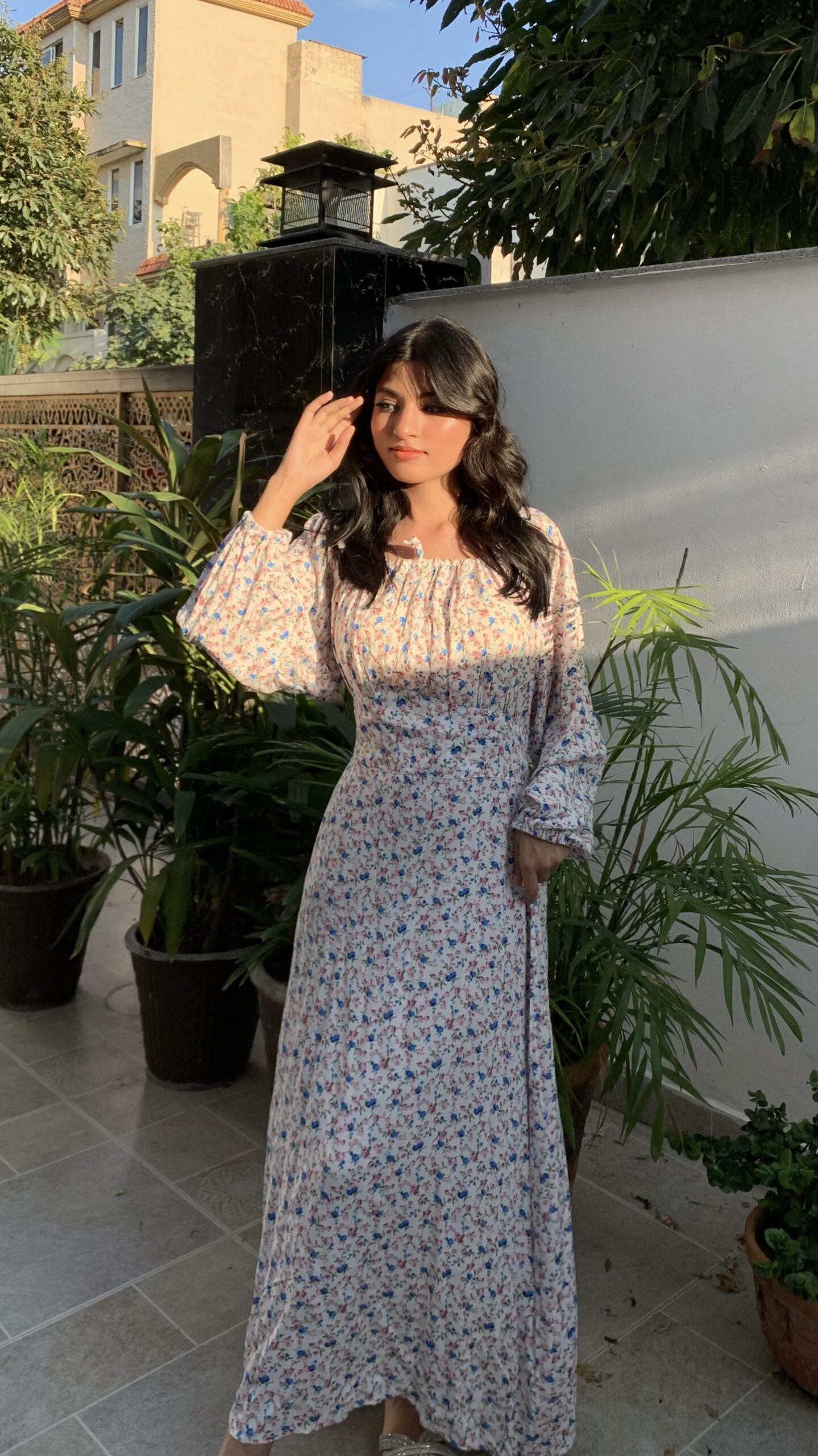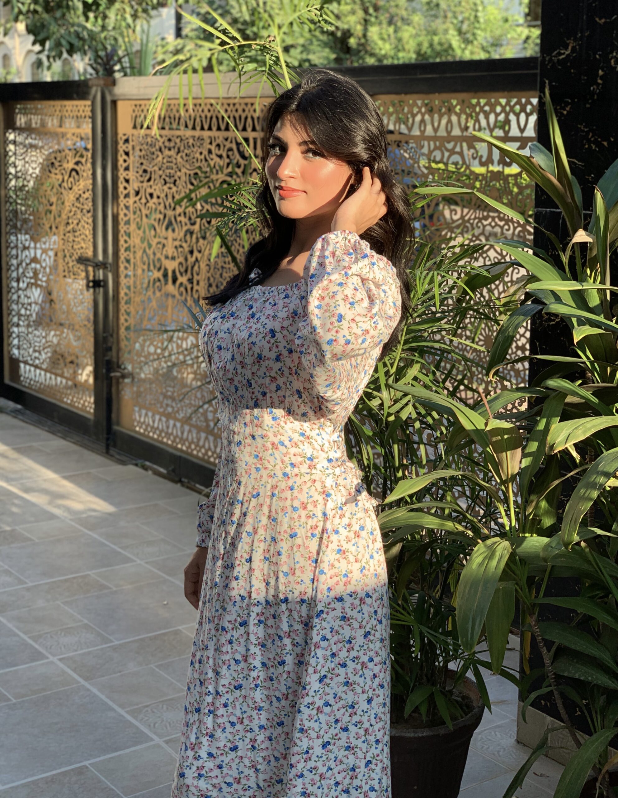 This lovely white floral dress features a delicate pattern of pink and blue flowers, perfect for a fresh, summery look. Made from lightweight fabric, it includes long puffed sleeves and a comfortable midi length. Ideal for casual outings or garden parties, pair it with sandals for a charming, effortless style.