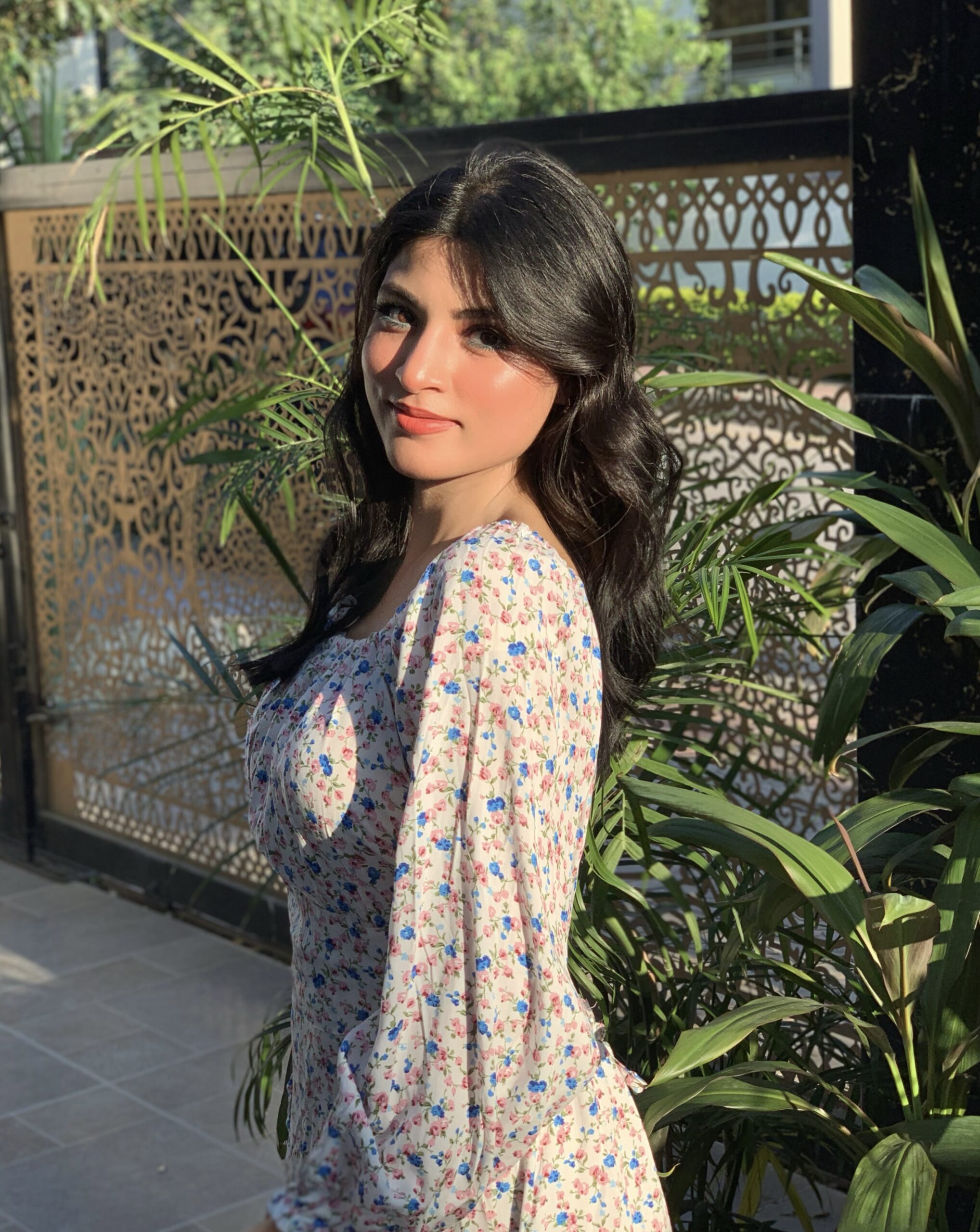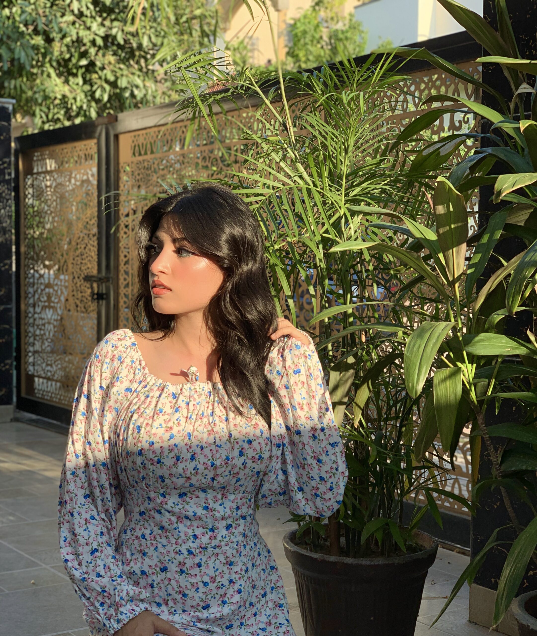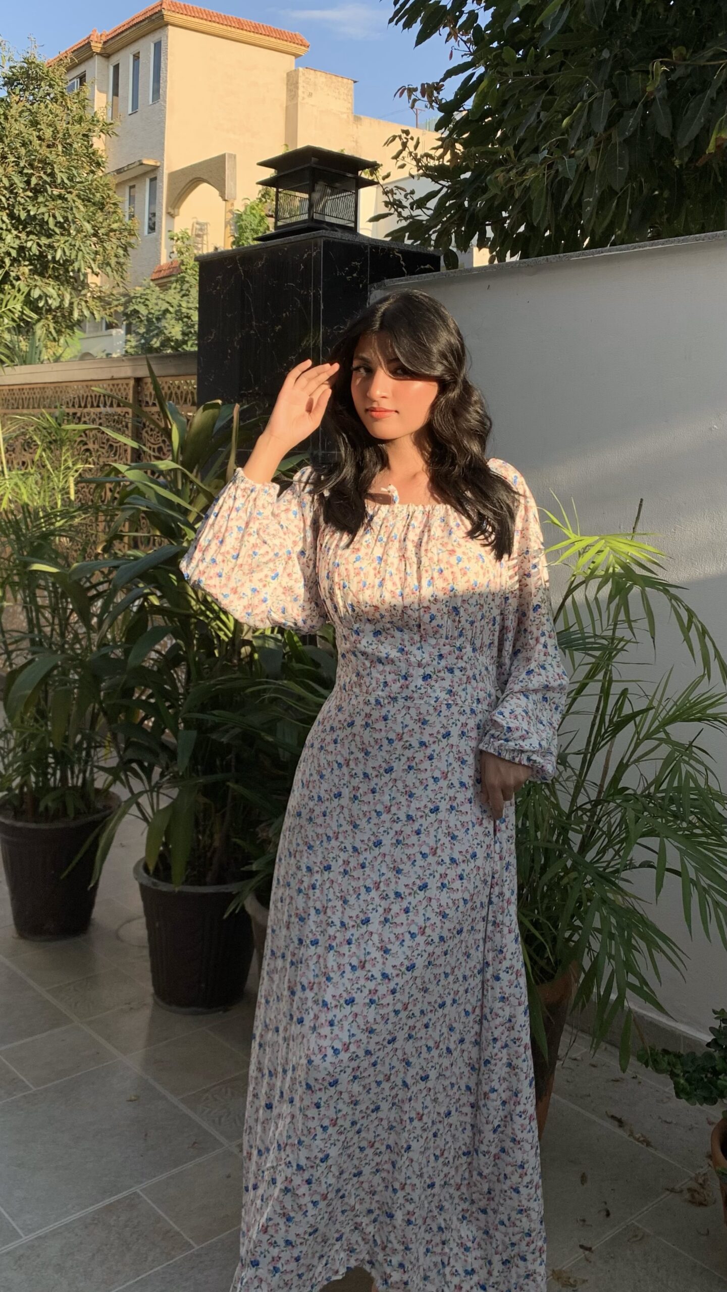 This lovely white floral dress features a delicate pattern of pink and blue flowers, perfect for a fresh, summery look. Made from lightweight fabric, it includes long puffed sleeves and a comfortable midi length. Ideal for casual outings or garden parties, pair it with sandals for a charming, effortless style.